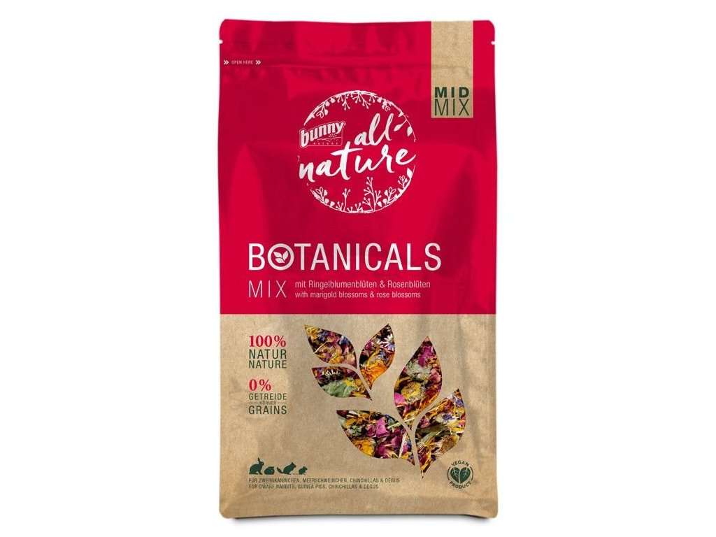 Přírodní bylinná směs s květy měsíčku lékařského, plátky růží, chrpou modrou a echinaceou je zdravým a chutným doplňkem stravy pro zakrslé králíky, morčata, činčily a osmáky.