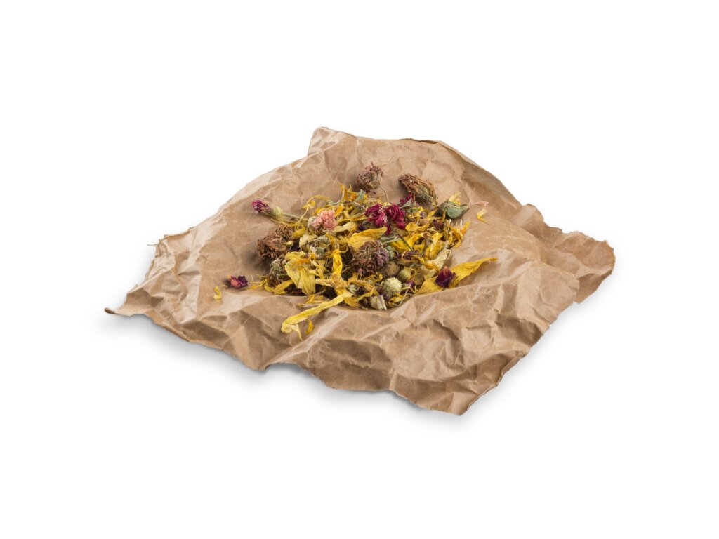 Složení: květy růže, jetel luční (20 %), květy chrpy luční červené, květy měsíčku lékařského, sedmikrásky (10 %), květy slunečnice, květy chrpy růžové