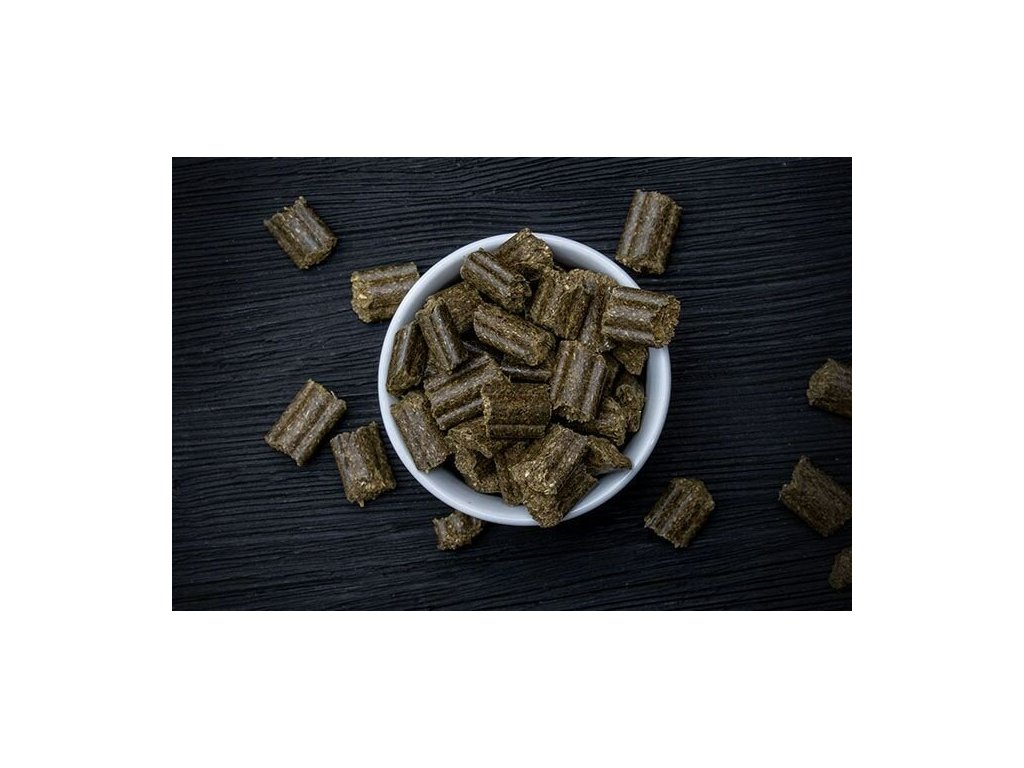 Díky speciálnímu způsobu výroby jsou obsažené byliny zpracovány v různé délce a tloušťce vláken. Proč? Zatímco neustále dorůstající řezáky a stoličky potřebují drsnou vláknitou strukturu pro řádné obrušování, jemné částice jsou zase dobré pro slepé střevo, které slouží jako fermentační komora. Specifická délka vláken je potřeba i pro zdravé zažívání.