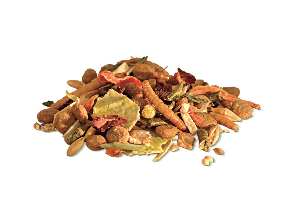 Složení: oves, ječmen, proso žluté, lesknice kanárská, hrachové vločky, kukuřice, pšeničné otruby, ovesné vločky, ječné vločky, slunečnicová semena zbavená oleje, proso bílé, rýže, pšenice, vojtěška, mrkev, kuře, proso červené, travní semena, pastinák, smetanka lékařská, uhličitan vápenatý, řebříček obecný, jitrocel kopinatý, pivovarské mláto, sezanm, květy heřmánku, lněná semínka, mrkvové výlisky, červená řepa, pivovarské kvasnice, sleďová moučka, živočišný tuk, inulin, květy měsíčku, mouční červi (0,3 %), extrakt z kuřecích játer, sušená vejce celá, karob, lososový olej, lněný olej, lecitin, květy růže