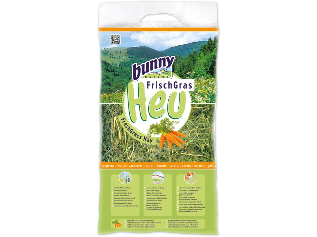 Seno Bunny FreshGrass zaručuje nejvyšší kvalitu a maximální pestrost obsažených rostlin. Díky tomu obsahuje dostatek živin a hlavně skvěle chutná! – obsahuje 18 druhů travin – přirozeně pestré složení obsažených travin – šetrně sušeno pod střechou teplým vzduchem – křupavé a bezprašné – šetrně sušeno pod střechou teplým vzduchem – obohaceno o mrkev, která je výborným zdrojem beta-karotenu
