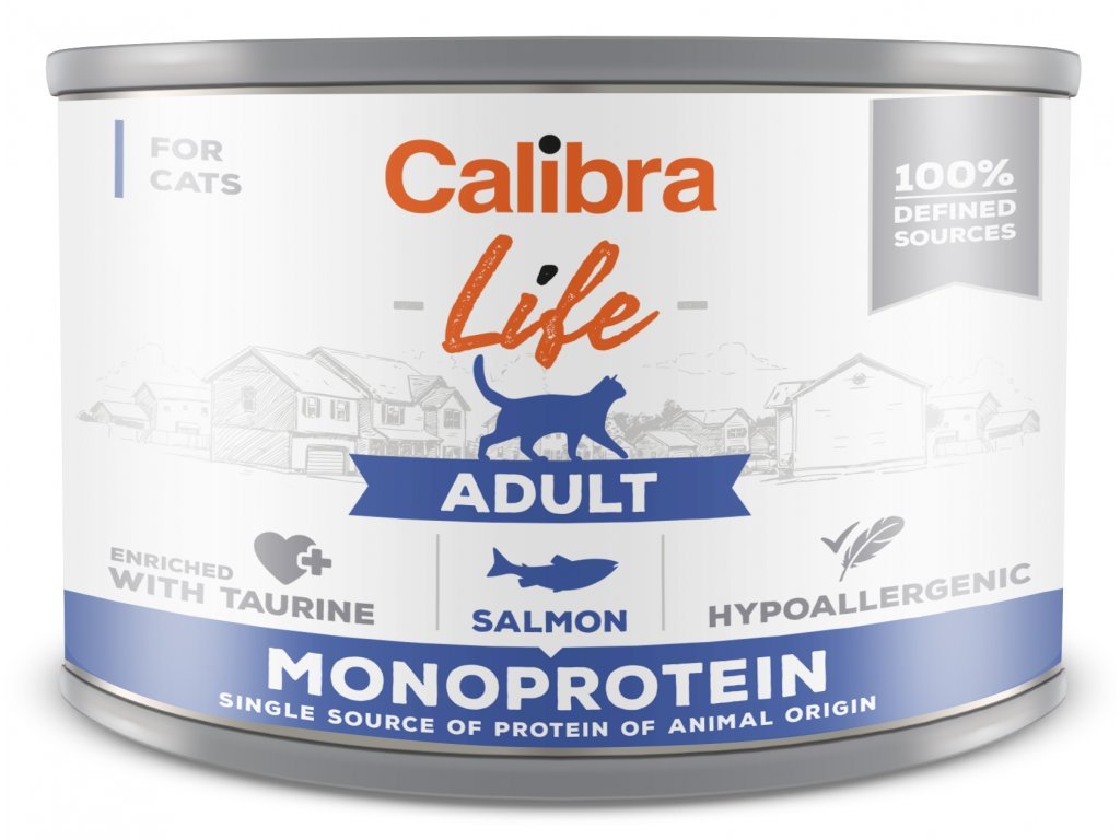 Calibra Cat Life Adult Salmon konzerva s lososem, která je určena pro dospělé kočky.