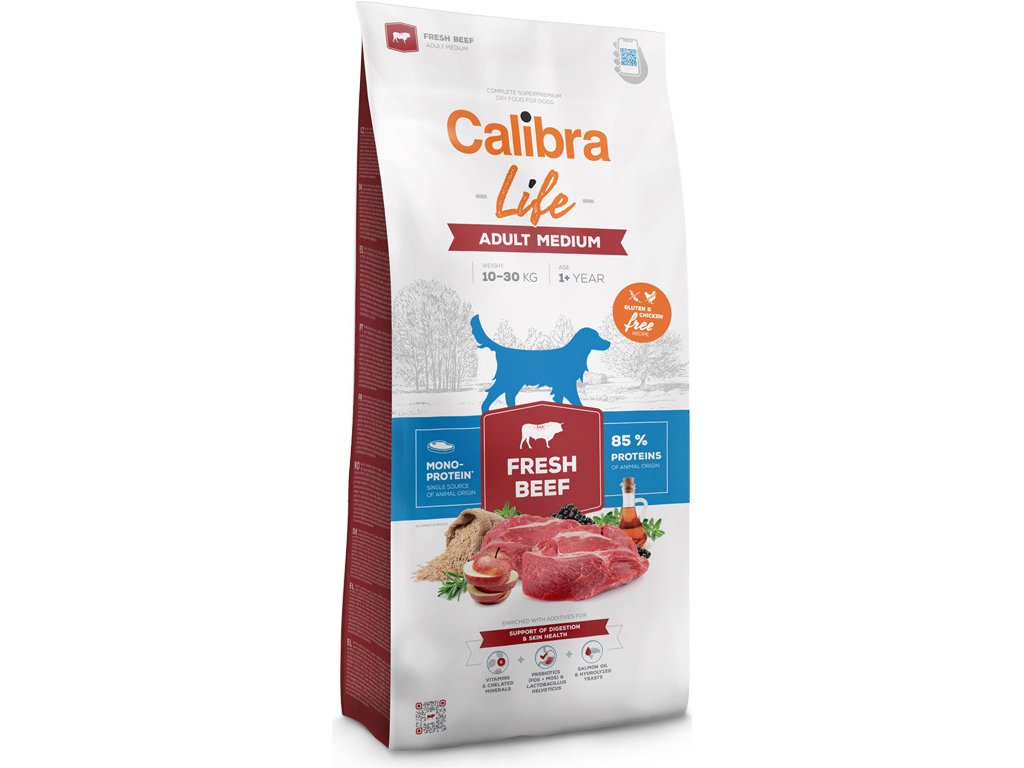 Granule Calibra Dog Life Adult Medium Fresh Beef s čerstvým hovězím pro dospělé psy středních plemen (10–30 kg) jsou skvěle stravitelné a vhodné i pro citlivé zažívání. Hovězí receptura je 100% monoproteinová, obsahuje 85 % proteinů živočišného původu. Neobsahuje lepek ani kuřecí. Krmivo obsahuje funkční aditiva na podporu zdravého zažívání a pro zdravou kůži a srst.