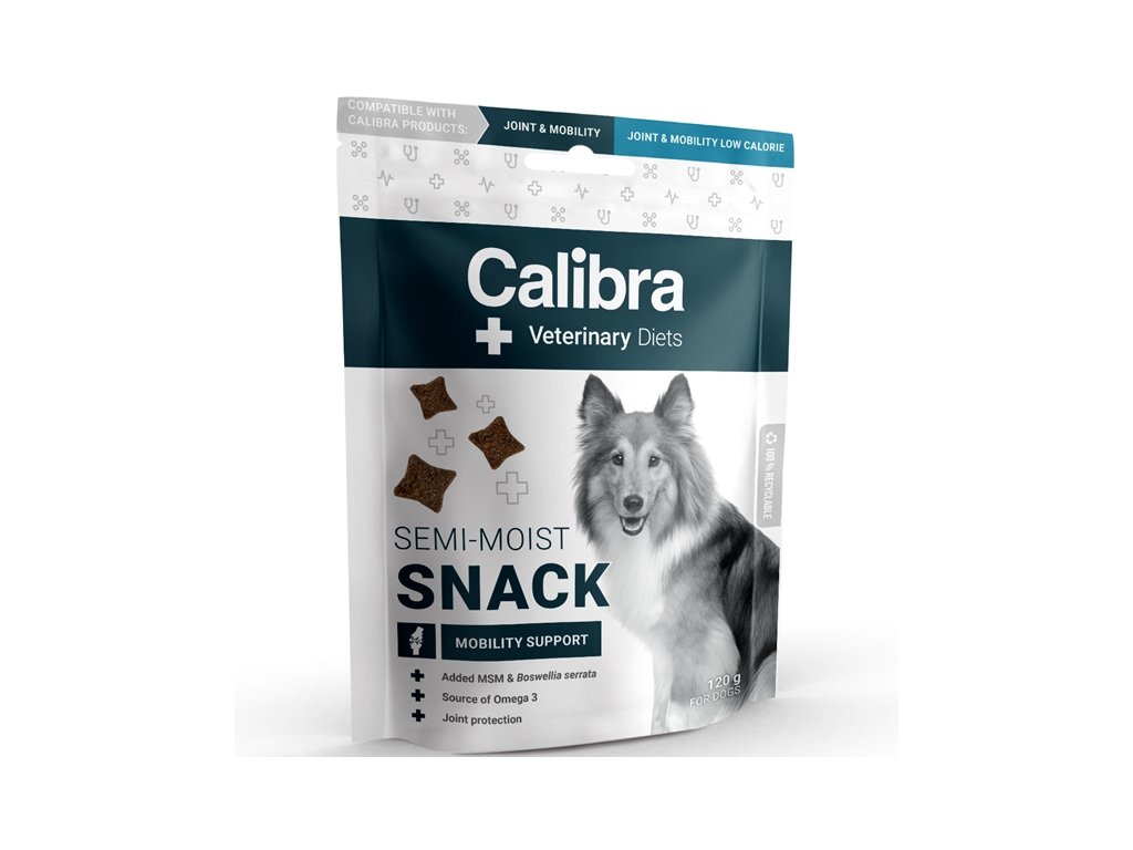 Receptura Mobility Support Semi-moist Snack je kompatibilní také s veterinární dietou Calibra VD Dog Joint & Mobility a Calibra VD Dog Joint & Mobility Low Calorie.