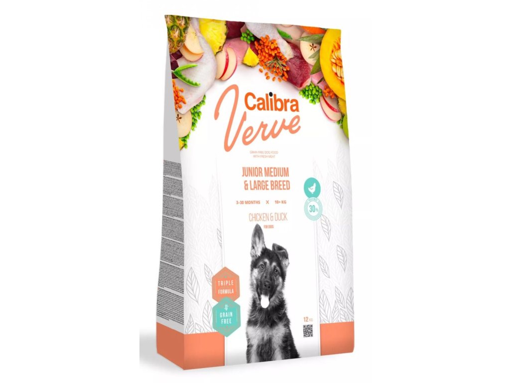 Calibra Dog Verve Junior Medium and Large Breed (Chicken & Duck) je kompletní suché krmivo s čerstvým masem a bez obilovin. Receptura je určená pro mladé psy ve věku 3-30 měsíců středních a velkých plemen s hmotností nad 10 kg.Vysoký obsah čerstvého kuřecího masa 30 % a kvalitní kachní protein je zárukou přirozeně výživné porce, která je v souladu s fyziologickými potřebami psa, potřebné pro správný růst a vývoj mladého organismu.
