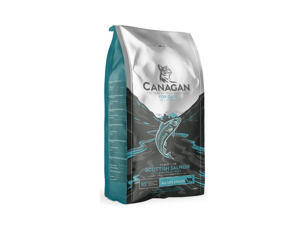 Kompletní krmivo pro kočky Canagan Scottish Salmon je pečlivě připravená bezobilná receptura, která kombinuje maso několika druhů ryb. Čerstvě připravený vykostěný losos je doplněn o sledě, pstruhy a bělomasé mořské ryby a všechny jsou zpracovávány podle standardů platných pro lidské potraviny. Živočišné suroviny jsou perfektně doplněny mnoha druhy zeleniny a bylin. Canagan Scottish Salmon se sníženým obsahem sacharidů představuje jedinečnou recepturu s biologicky snadno dostupnými bílkovinami.