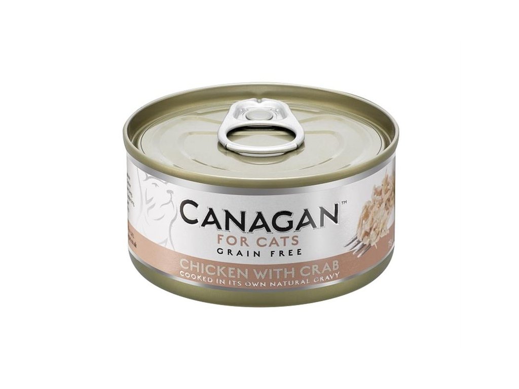 Canagan Cat Chicken with Crab – je kompletní krmivo pro kočky. Vyrobené je z čerstvého kuřecího masa bez kůže. Kuře doplňují lahodná sousta krabího masa – vše šetrně vařené ve vlastní šťávě pro zachování vysoké výživové hodnoty krmiva.Stejně jako v ostatních výrobcích značky Canagan, ani v těchto konzervách pro kočky nenajdete žádné obiloviny.Konzervu můžete Vaší kočce podávat samostatně nebo v kombinaci s granulemi, nezapomeňte však upravit podávané množství.