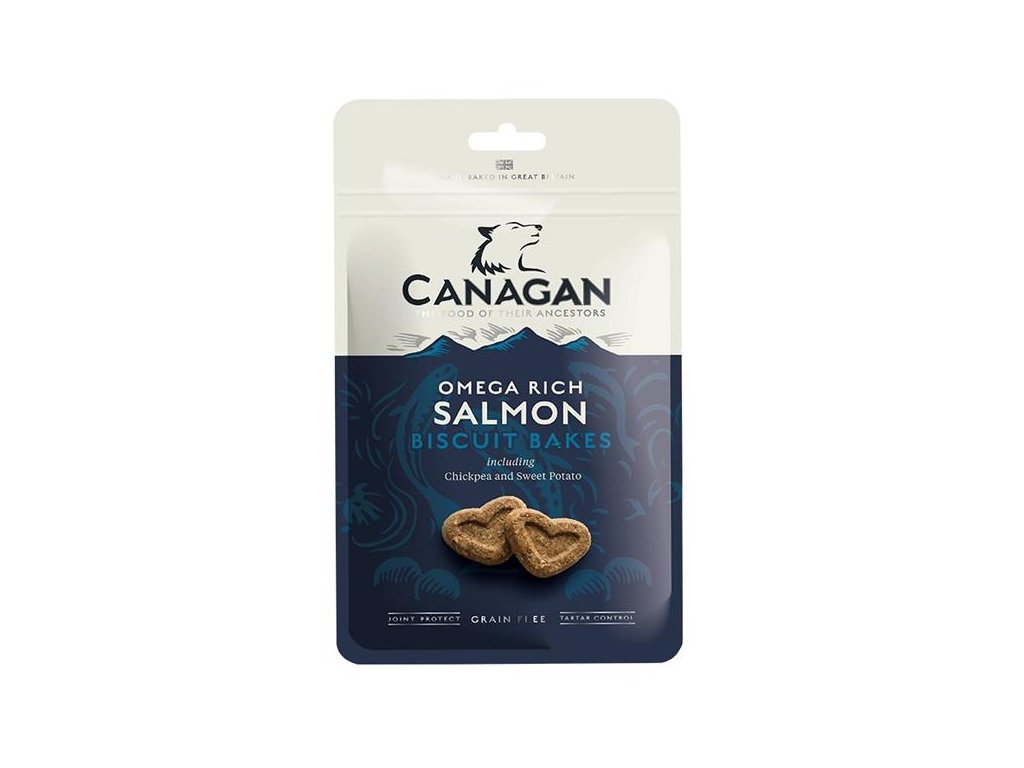 Canagan Biscuit Bakes Salmon – doplňkové krmivo pro psy = ručně pečené bezobilné sušenky s masem z lososa. Lahodná směs masa z lososů, cizrny, sladkých brambor a bylinek je dokřupava vypečená v pecích vyhřívaných dřevem, a i díky tomu tak skvěle voní i chutná. V sušenkách jsou navíc doplněny složky pro ochranu kloubů a pro zdravé zuby a dásně vašeho psa.