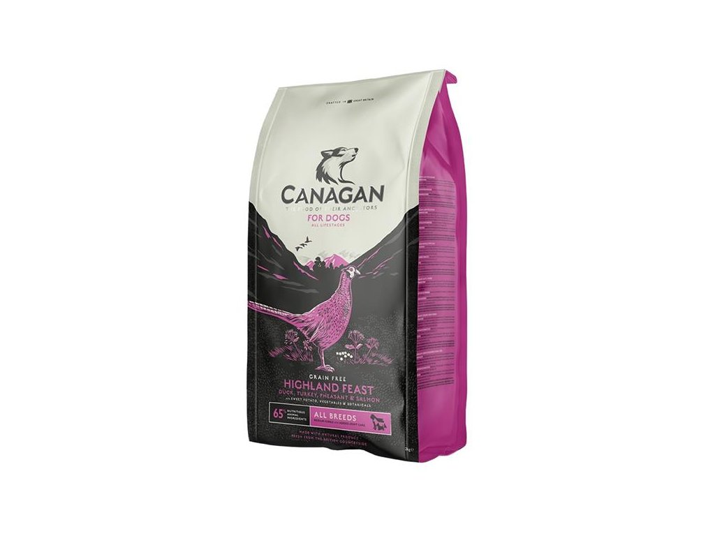 Kompletní krmivo pro psy Canagan Highland Feast je pečlivě připravená bezobilná receptura, vyrobená ze zcela jedinečných surovin, s vysokým obsahem snadno stravitelných proteinů. Čerstvě připravené maso z kachny, krůty, bažanta a lososa pochází a je i zpracováváno dle lidských potravinářských standardů. Přidaný glukosamin a chondroitin pomáhají pečovat o zdraví kloubů. Prebiotika podporují růst prospěšných bakterií a tím i zdravé trávení.