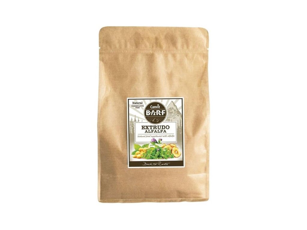 Canvit B.A.R.F. Extrudo Alfalfa je extrudovaná příloha k BARF stravě ve formě sušenek. Obsahuje vysoce stravitelnou vojtěšku (alfalfa), sušená jablka a hrášek jako přírodní zdroje vlákniny. Vojtěška je vhodná i pro zlepšení trávení a pomáhá při překyselení žaludku. Produkt navíc obsahuje pivovarské kvasnice, přírodní zdroj vitamínů skupiny B, kokosový a lněný olej a směs bylin (pampeliška, kopřiva a ostropestřec mariánský).