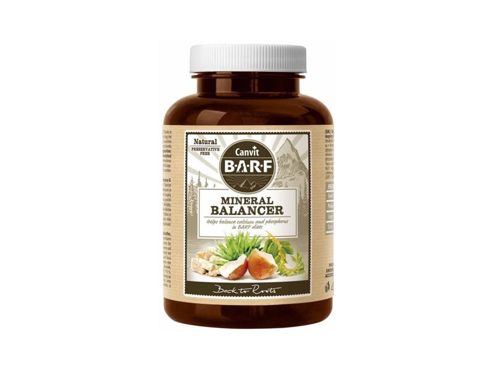 Canvit B.A.R.F. Mineral Balancer je přírodní zdroj vápníku, minerálů, mikroprvků a vitamínů skupiny B pro psy. Díky obsaženým vaječným skořápkám, přírodnímu a lehce využitelnému zdroji vápníku, je vhodným doplňkem zejména pro psy krmené BARF stravou. Obsažená hnědá řasa kelpa (Ascophyllum nodosum) je přírodním zdrojem minerálů a mikroprvků a má výborné antioxidační účinky. Přírodním zdrojem vitamínů skupiny B a aminokyselin jsou pivovarské kvasnice, které podporují imunitu.Zelená řasa chlorela a Yucca schidigera, pouštní bylina s vysokým obsahem saponinů, podporují trávení a působí detoxikačně.