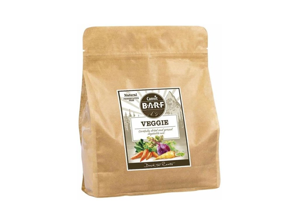 Zelenina hraje v jídelníčku B.A.R.F. nezastupitelnou roli, doplňuje v organismu nezbytné vitamíny, minerály a je zdrojem nepostradatelné vlákniny, důležité pro zdravé zažívání. Zeleninový mix Canvit Veggie obsahuje špenát, pastinák, petržel, celer, červenou řepu a mrkev v optimálních poměrech.Zelenina je šetrně zpracovaná sušením a mletím tak, aby si zachovala původní nutriční vlastnosti. Výhodou mleté zeleniny je její vysoká stravitelnost a využitelnost výživných látek v porovnání se zeleninou podávanou v syrovém stavu.Doplňkové krmivo pro psy.