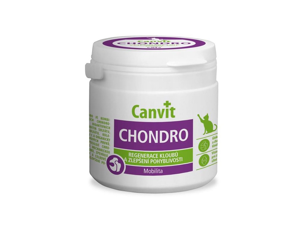 Canvit Chondro pro kočky je pro regeneraci kloubů a zlepšení pohyblivosti. Je to kombinace unikátních chondroprotektiv & bioaktivních látek: chondroitin sulfátu, glukosamin sulfátu, kolagenu, vitaminu C a organicky vázaných stopových prvků. Tyto látky posilují chrupavku, zvyšují mechanickou odolnost kloubů, zpevňují vazy a šlachy a celkově přispívají ke zlepšení pohyblivosti. Vhodné pro stárnoucí kočky, rostoucí kočky velkých plemen a kočky s nadváhou.