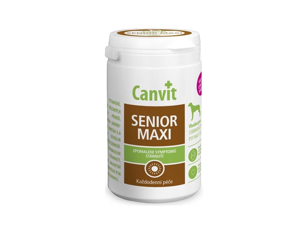 Zdroj aminokyselin, vitamínů, omega-3 a omega-6 nenasycených mastných kyselin, prebiotik a kolagenu pro zpomalení příznaků stárnutí a udržení kondice u psů starších 7 let.Stárnutí u psů je doprovázeno změnou metabolismu, která ovlivňuje kondici a aktivitu. U stárnoucích psů dochází ke ztrátě svalové hmoty, psi omezují svou aktivitu, přibývají na váze a zhoršuje se funkce imunitního a nervového systému. Canvit Senior je bohatým zdrojem aminokyselin pro udržení svalové hmoty a kondice, vitamínů a omega-3 a omega-6 nenasycených mastných kyselin pro zlepšení obranyschopnosti a paměti u starších psů.