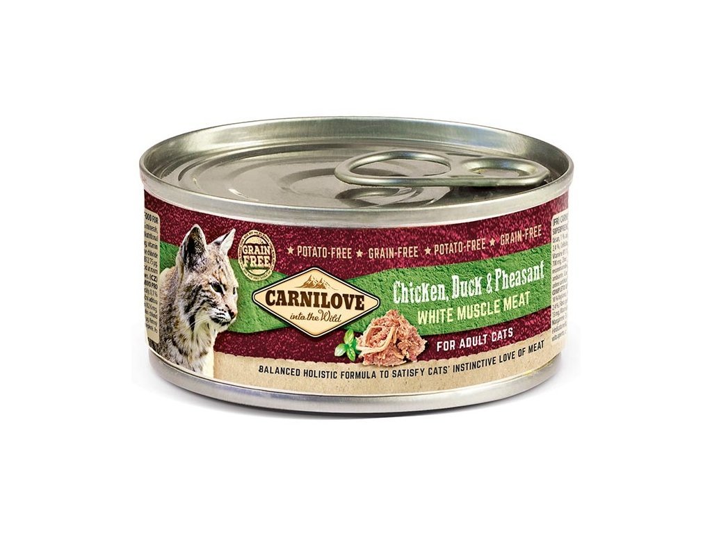 Carnilove Cat konzerva Mus Meat Duck & Pheasant je kompletní superprémiové vlhké krmivo pro dospělé kočky. Receptura z kuřecího, kachního a bažantího masa si zamiluje i ten největší kočičí mlsoun. Konzerva je zcela bez obilovin a brambor. Brusinky zajistí Vaší kočce zdravé močové cesty. Konzerva obsahuje pouze trhané kuřecí, kachní, bažantí maso a lahodný vývar.