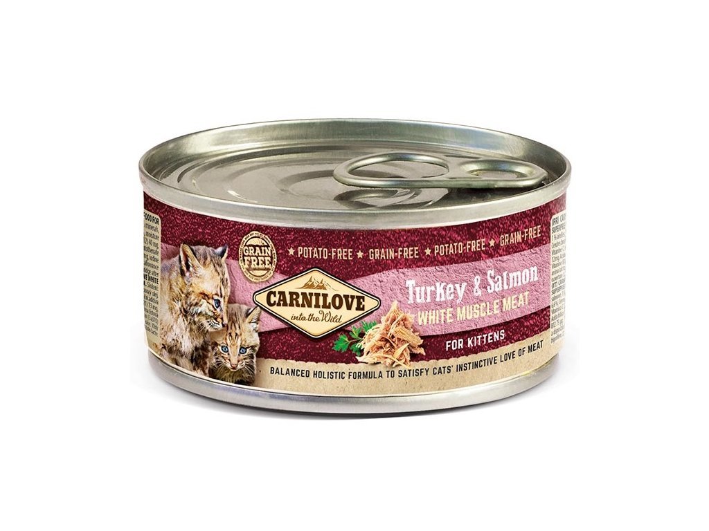 Carnilove Cat konzerva Mus Meat Turkey & Salmon Kitten je kompletní superprémiové vlhké krmivo pro koťata. Receptura z krocaní svaloviny a vnitřností je zcela bez obilovin a dalších přidaných látek. Lososový olej zaručí Vašemu koťátku zdravou srst a kůži. Brusinky zajistí zdravé močové cesty. Konzerva obsahuje pouze trhané maso z krocana, lososa a lahodný vývar.