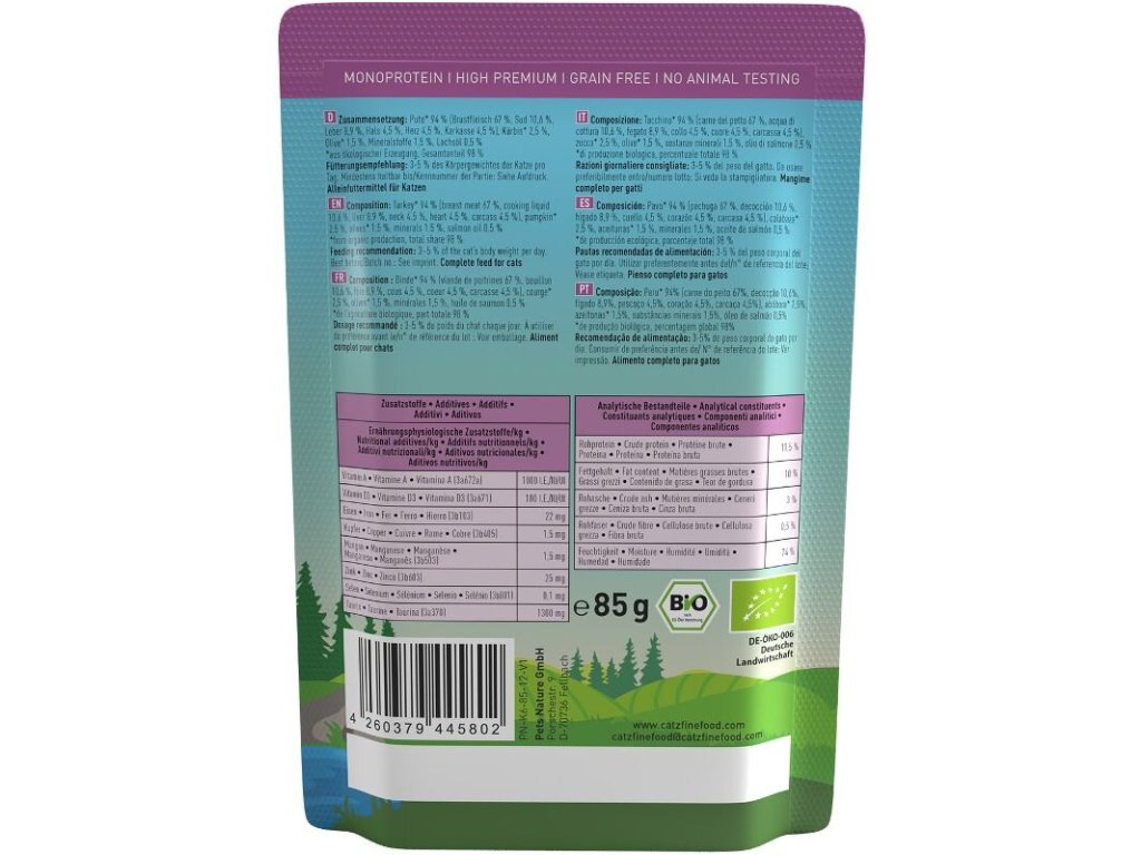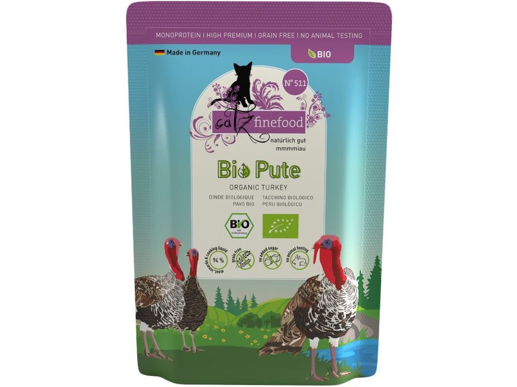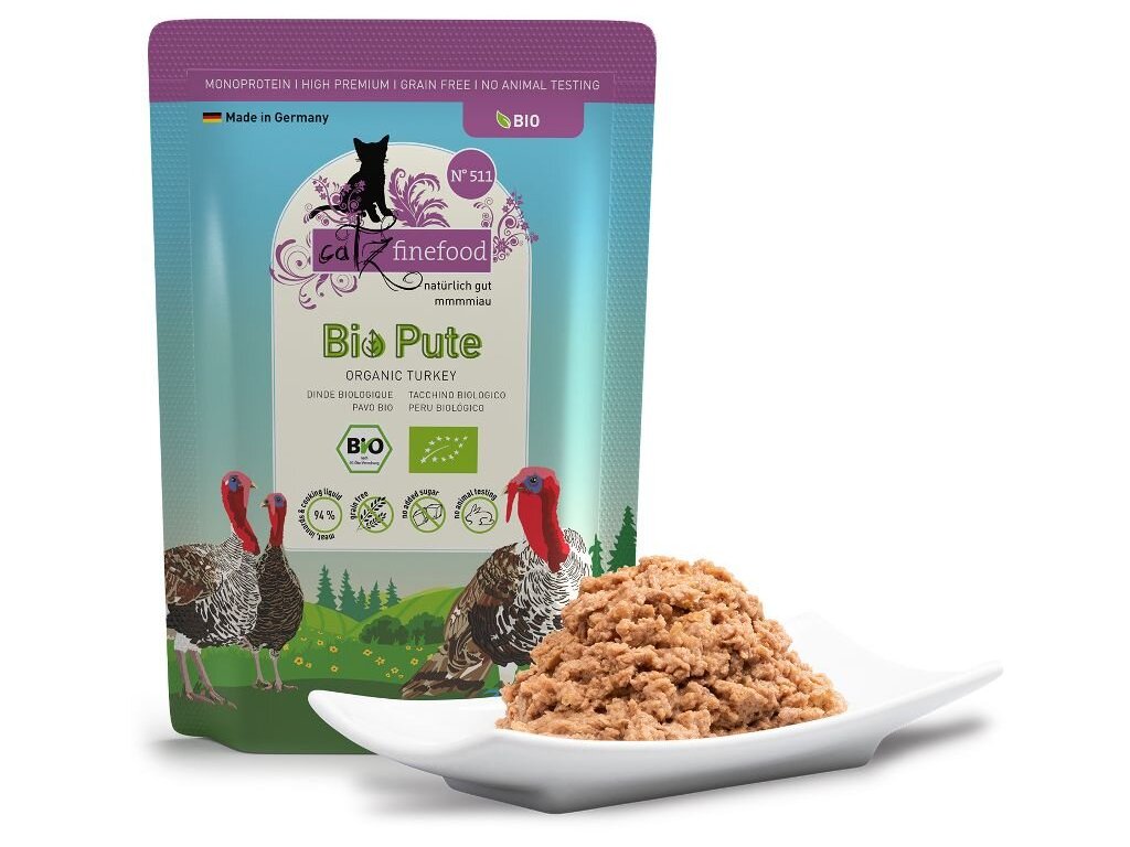 Kompletní monoproteinové krmivo v bio kvalitě, které zajistí vaší kočce vyváženou stravu. Všechny suroviny jsou certifikované a pochází z ekologického zemědělství. Kočky milují výtečnou chuť čerstvě zpracovaného masa a drobů té nejvyšší kvality. Krmivo Catz finefood Bio je ideální také pro kočky s citlivým zažíváním či potravinovými alergiemi.