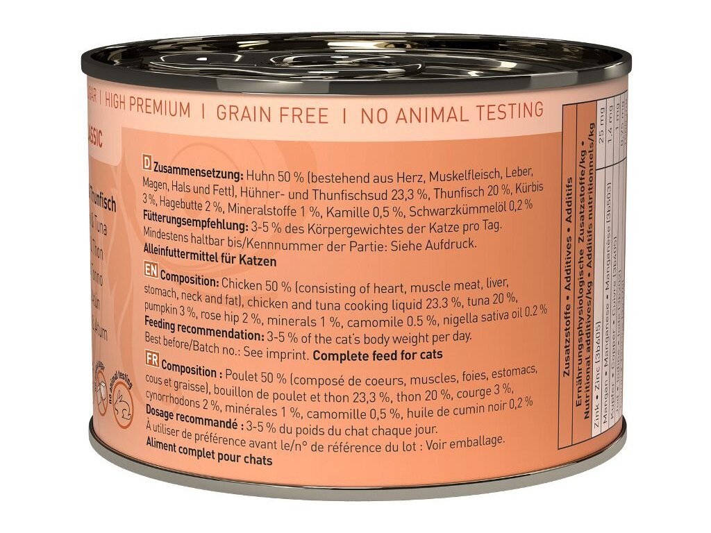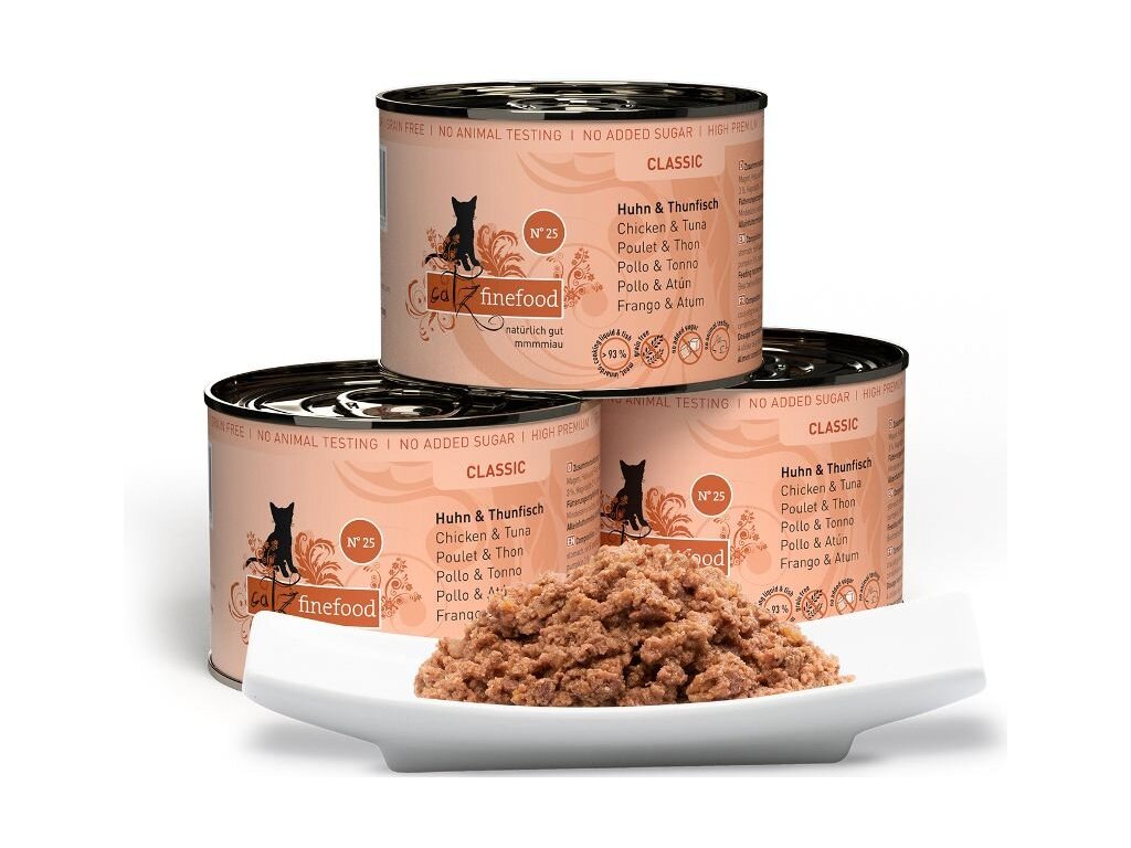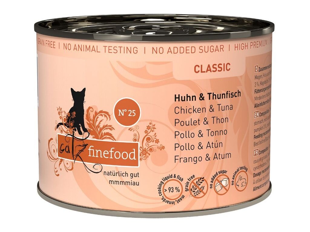 Lahodná konzerva pro kočky, která obsahuje vysoký podíl kuřecího masa a tuňáka, zdraví prospěšné šípky a heřmánek. Konzervy Catz finefood obsahují pouze suroviny vysoké potravinářské kvality a svým složením odpovídají přirozené kočičí stravě. Jsou bez konzervantů, umělých barviv a dochucovadel. Konzervy neobsahují geneticky upravené suroviny. Jedná se o kompletní krmivo.