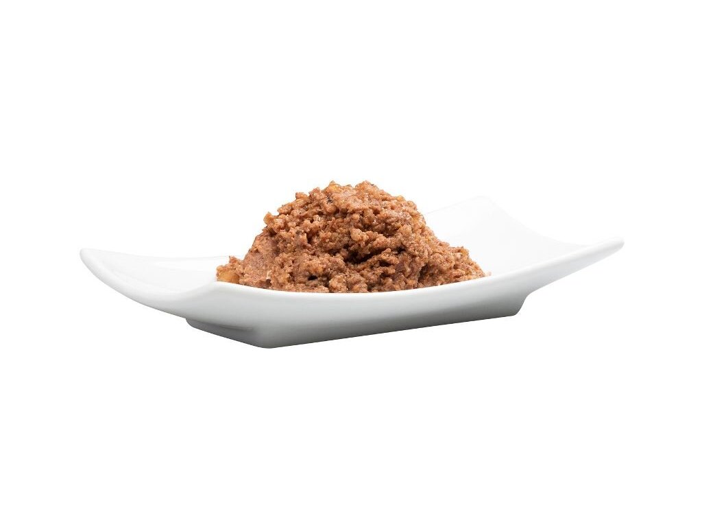 Složení: kuřecí maso 50% (srdce, svalovina, játra, žaludek, krk a tuk), vývar z kuřete a tuňáka 23,3%, tuňák 20%, dýně 3%, šípky 2%, minerály 1%, heřmánek 0,5%, olej ze semen černuchy seté 0,2%