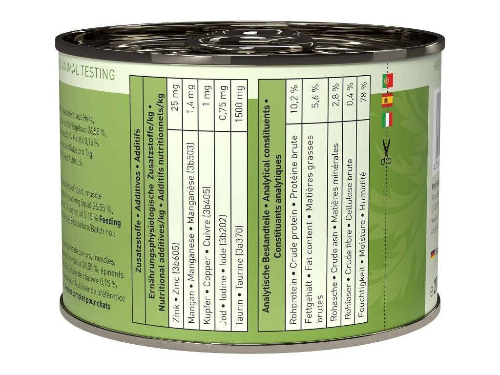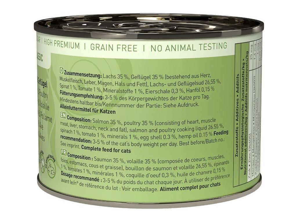 Složení: maso z lososa 35%, drůbeží maso 35% (srdce, svalovina, játra, žaludek, krk a tuk), vývar z lososa a drůbeže 26,55%, špenát 1%, rajčata 1%, minerální látky 1%. vaječné skořápky 0,3%, konopný olej 0,15%