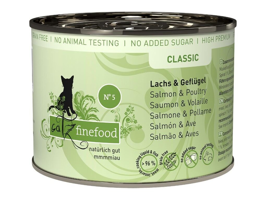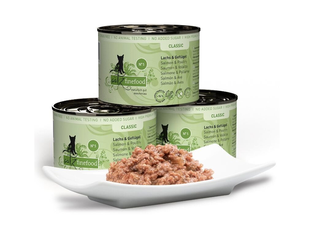 Lahodná konzerva pro kočky, která obsahuje vysoký podíl masa z lososa, jemného drůbežího masa, zdravý špenát a rajčata. Konzervy a kapsičky Catz finefood obsahují pouze suroviny vysoké potravinářské kvality a svým složením odpovídají přirozené kočičí stravě. Jsou bez konzervantů, umělých barviv a dochucovadel a neobsahují geneticky upravené suroviny. Jedná se o kompletní krmivo.