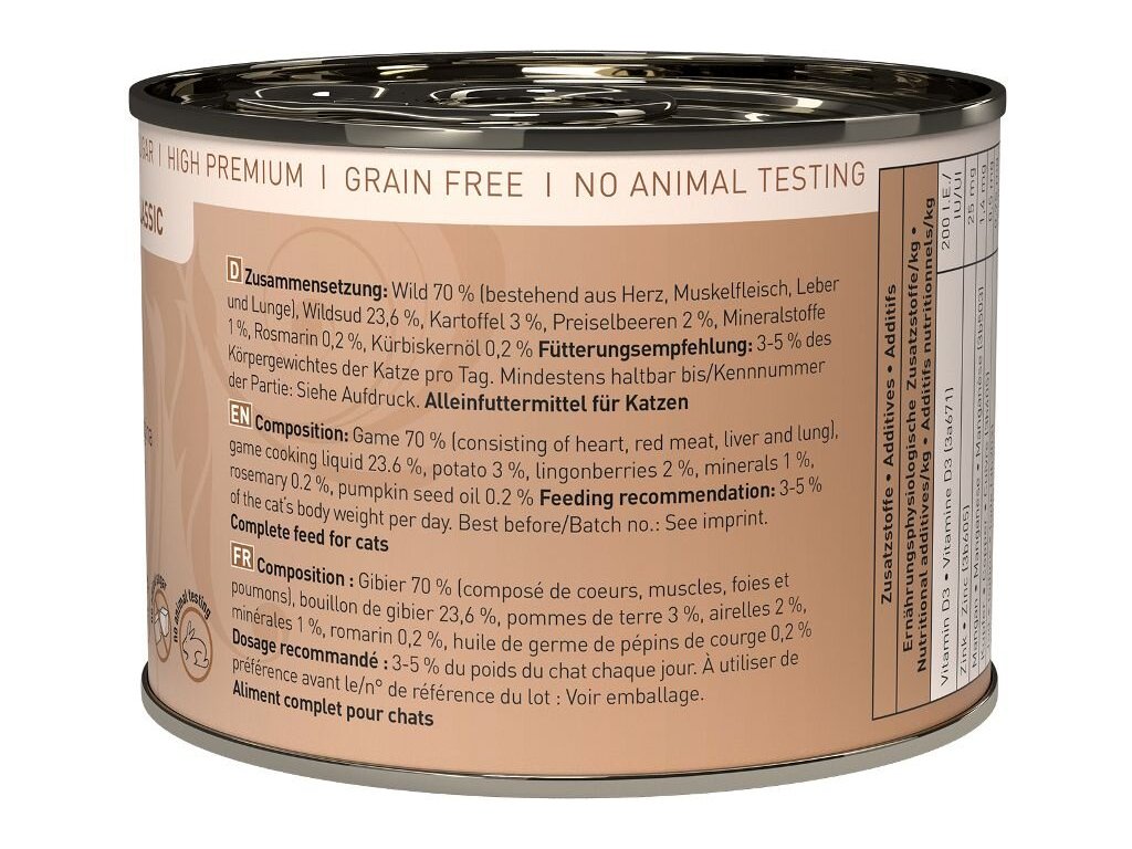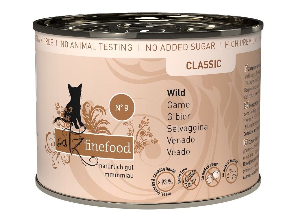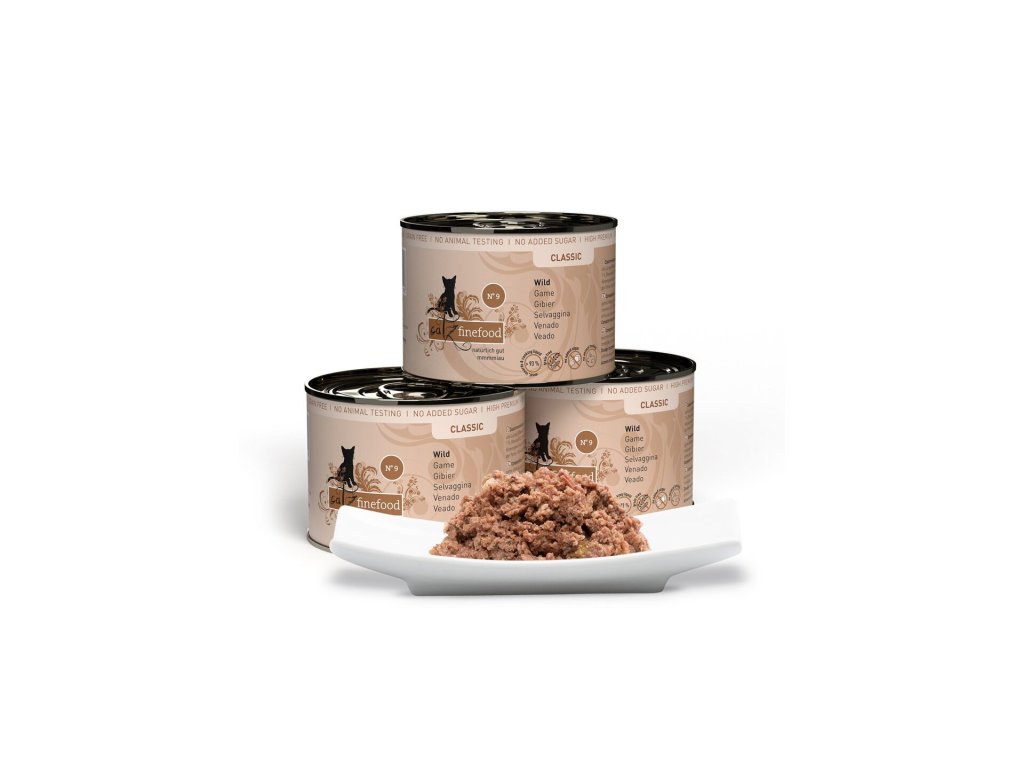 Lahodná konzerva pro kočky, která obsahuje vysoký podíl zvěřiny, zdraví prospěšné brusinky a brambory. Konzervy Catz finefood obsahují pouze suroviny vysoké potravinářské kvality a svým složením odpovídají přirozené kočičí stravě. Jsou bez konzervantů, umělých barviv a dochucovadel. Konzervy neobsahují geneticky upravené suroviny. Jedná se o kompletní krmivo.