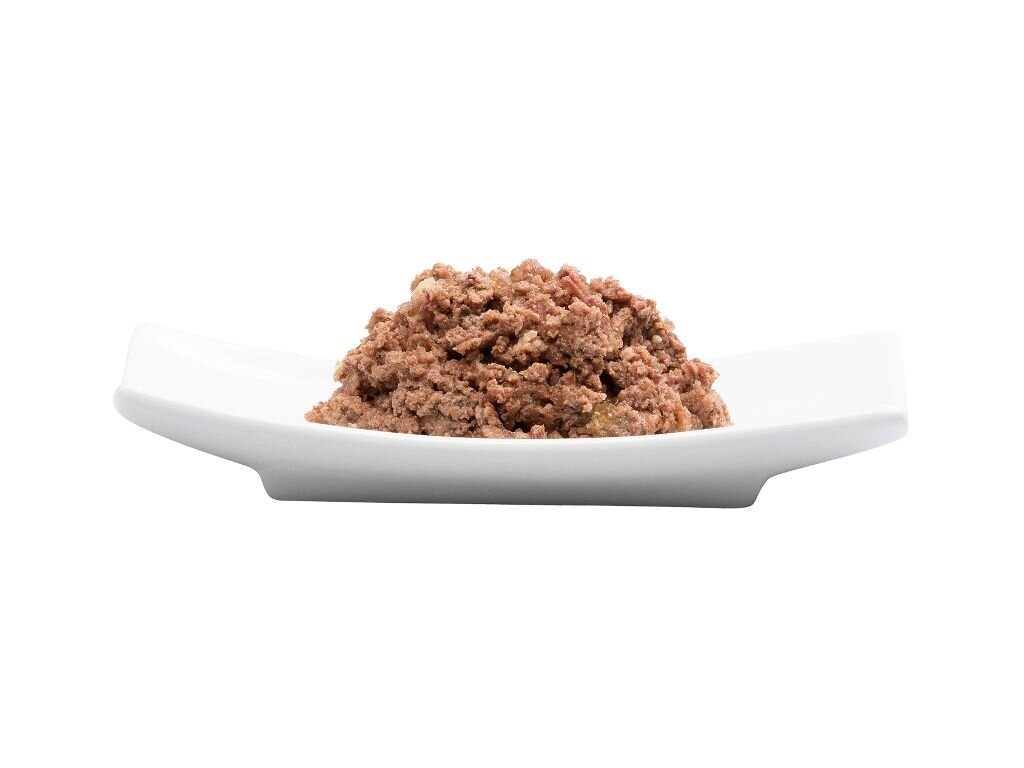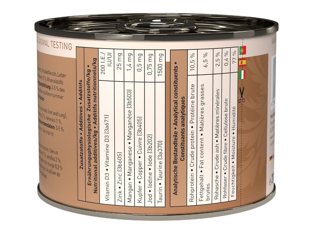 Složení: zvěřina 70% (srdce, svalovina, játra a plíce), zvěřinový vývar 23,6%, brambory 3%, brusinky 2%, minerály 1 %, rozmarýn 0,2%, dýňový olej 0,2%