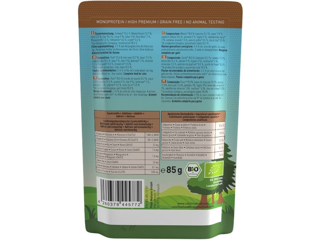 Kompletní monoproteinové krmivo v bio kvalitě, které zajistí vaší kočce vyváženou stravu. Všechny suroviny jsou certifikované a pochází z ekologického zemědělství. Kočky milují výtečnou chuť čerstvě zpracovaného masa a drobů té nejvyšší kvality. Krmivo Catz finefood Bio je ideální také pro kočky s citlivým zažíváním či potravinovými alergiemi.