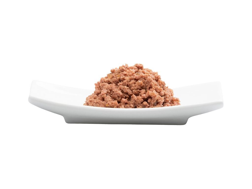 Složení: kuřecí maso 50% (srdce, svalovina, játra, žaludek, krk a tuk), vývar z kuřete a tuňáka 23,3%, tuňák 20%, dýně 3%, šípky 2%, minerály 1%, heřmánek 0,5%, olej ze semen černuchy seté 0,2%