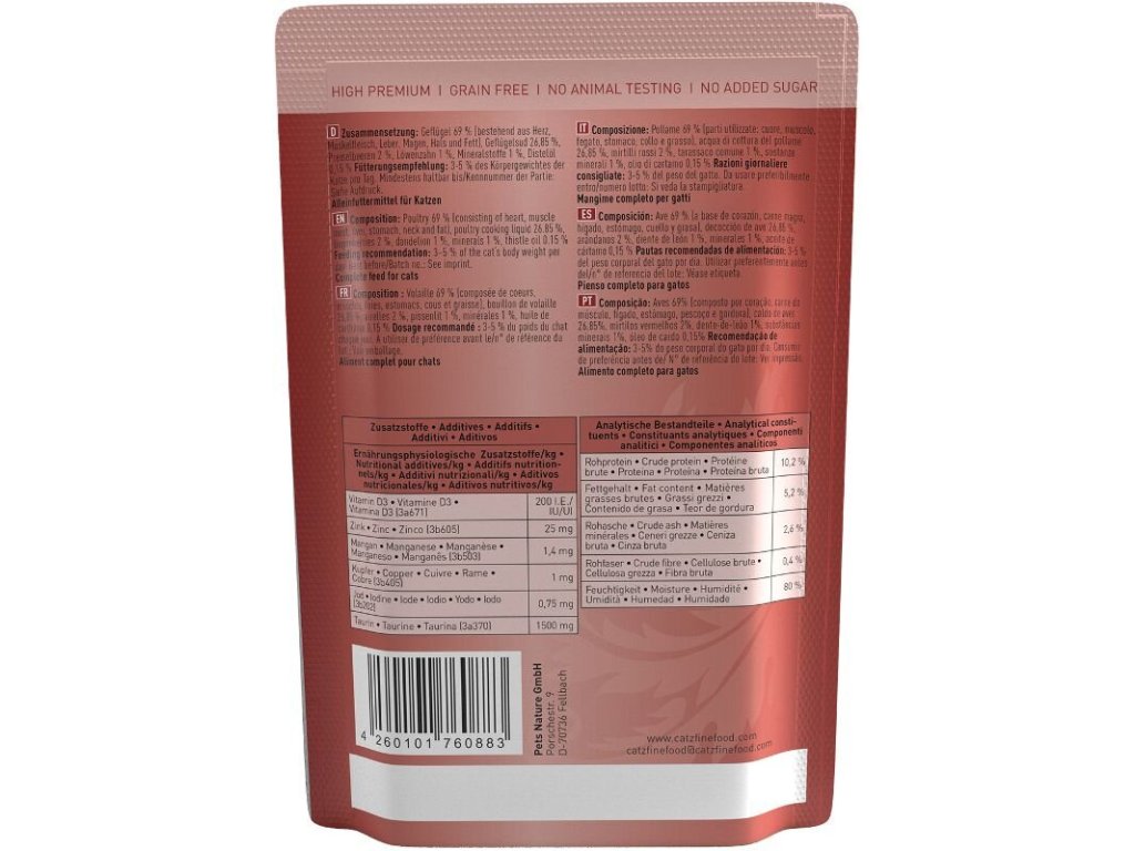 Lahodná kapsička pro kočky, která obsahuje vysoký podíl drůbežího masa, zdravé brusinky a smetánku lékařskou. Kapsičky Catz finefood obsahují pouze suroviny vysoké potravinářské kvality a svým složením odpovídají přirozené kočičí stravě. Jsou bez konzervantů, umělých barviv a dochucovadel. Kapsičky neobsahují geneticky upravené suroviny. Jedná se o kompletní krmivo.
