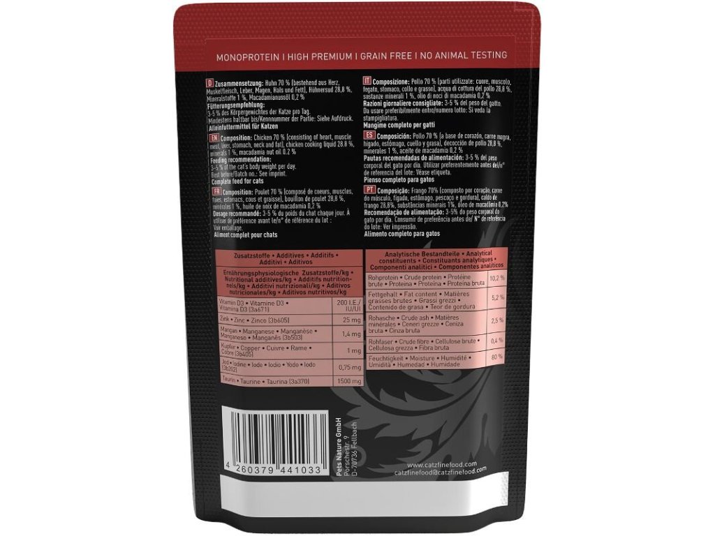 Lahodná kapsička pro kočky, která obsahuje pouze kuřecí maso, vnitřnosti, vývar, minerální látky a makadamový olej. Konzerva je vhodná i pro kočky s citlivým zažíváním nebo pro alergické kočky. Jedná se o kompletní krmivo. Suroviny jsou vysoké potravinářské kvality a svým složením odpovídají přirozené kočičí stravě. Jsou bez konzervantů, umělých barviv a dochucovadel. Konzervy neobsahují geneticky upravené suroviny.