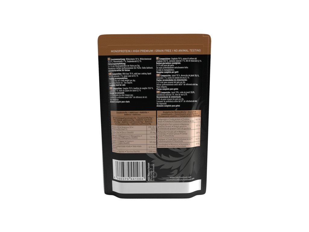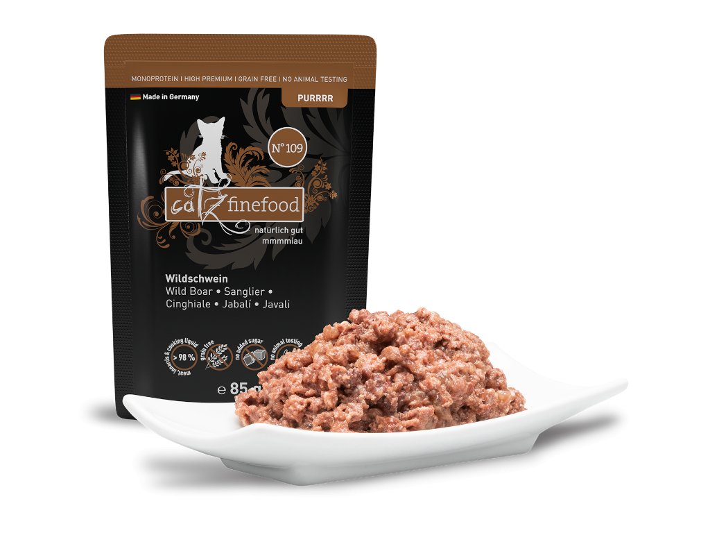 Lahodná kapsička pro kočky, která obsahuje pouze kančí maso, vývar, minerální látky a hroznový olej. Je tak vhodná i pro kočky s citlivým zažíváním nebo pro alergické kočky. Jedná se o kompletní krmivo. Suroviny jsou vysoké potravinářské kvality a svým složením odpovídají přirozené kočičí stravě. Jsou bez konzervantů, umělých barviv a dochucovadel. Konzervy neobsahují geneticky upravené suroviny.