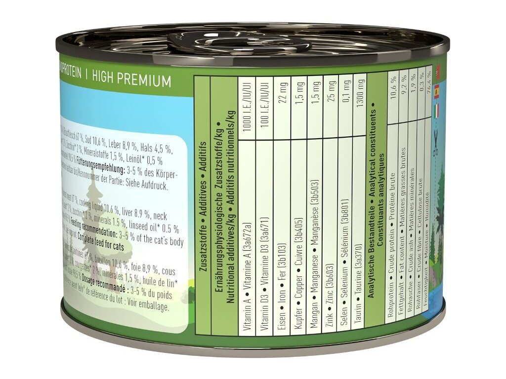 Složení: kachna 94 % (kachní prsa 67 %, vývar 10,6%, játra 8,9%, krk 4,5 %, srdce 4,5 %, skelet 4,5%), hruška 2 %, cuketa 2 %, minerální látky 1,5 %, lněný olej 0,5 %