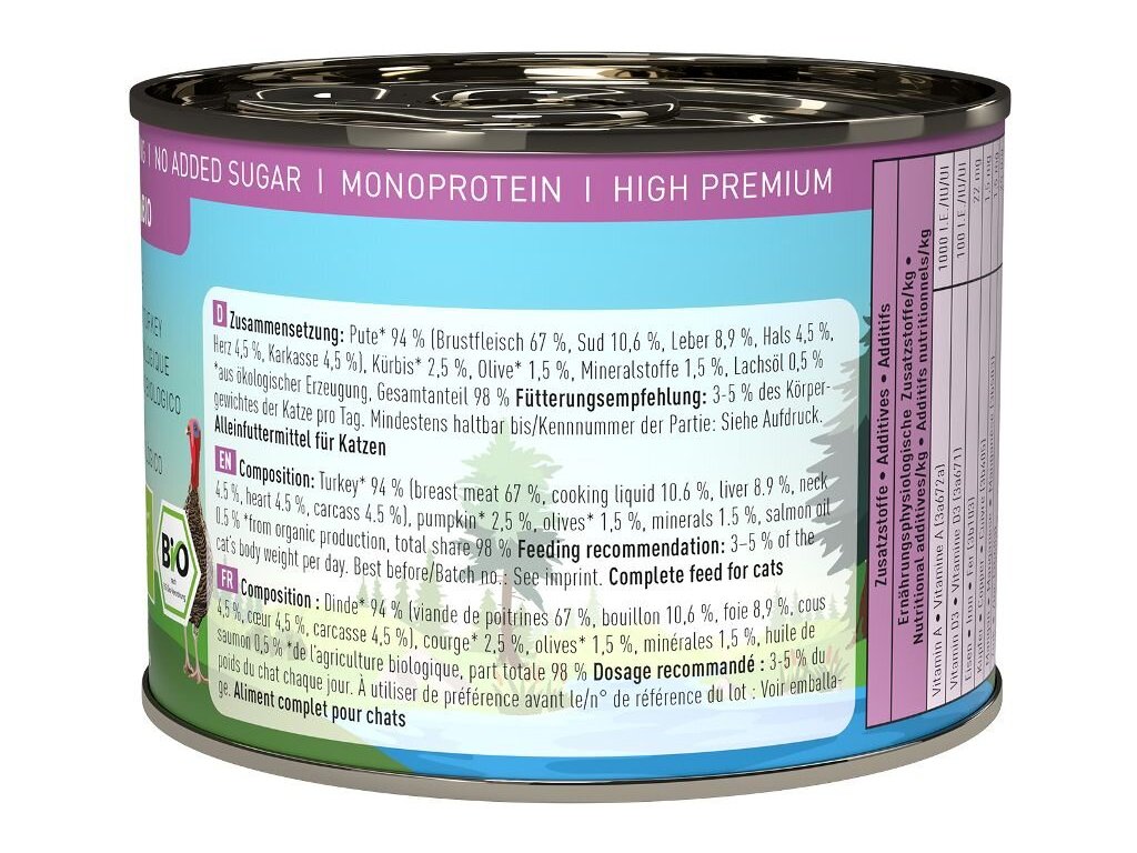 Kompletní monoproteinové krmivo v bio kvalitě, které zajistí vaší kočce vyváženou stravu. Všechny suroviny jsou certifikované a pochází z ekologického zemědělství. Kočky milují výtečnou chuť čerstvě zpracovaného masa a drobů té nejvyšší kvality. Krmivo Catz finefood Bio je ideální také pro kočky s citlivým zažíváním či potravinovými alergiemi.