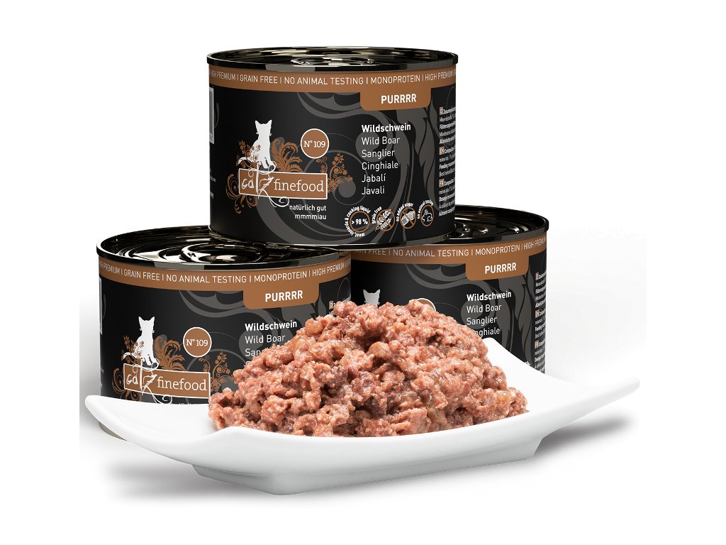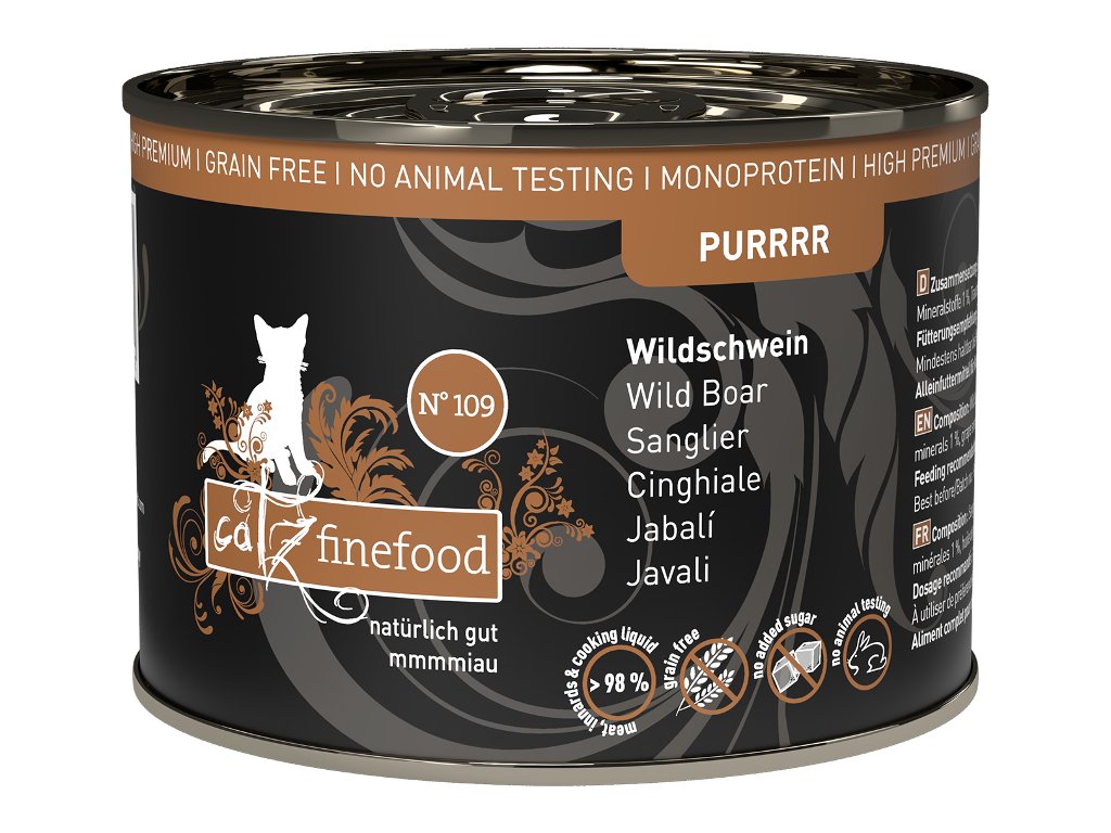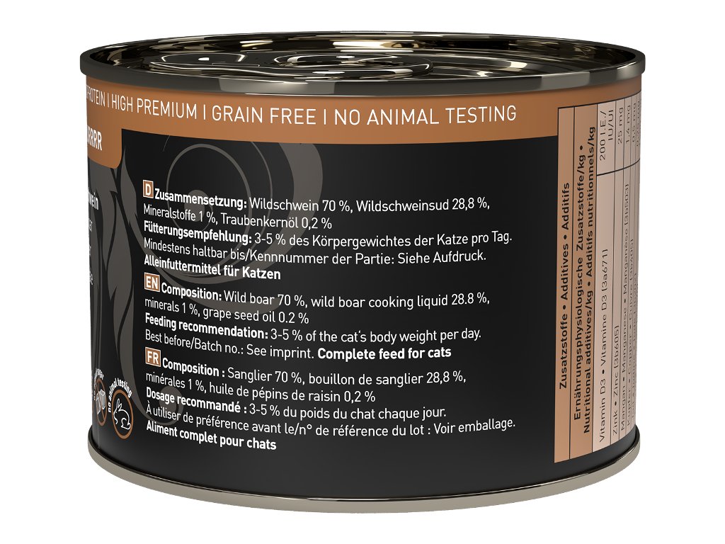 Lahodná konzerva pro kočky, která obsahuje pouze kančí maso, vývar, minerální látky a hroznový olej. Konzerva je tak vhodná i pro kočky s citlivým zažíváním nebo pro alergické kočky. Jedná se o kompletní krmivo. Suroviny jsou vysoké potravinářské kvality a svým složením odpovídají přirozené kočičí stravě. Jsou bez konzervantů, umělých barviv a dochucovadel. Konzervy neobsahují geneticky upravené suroviny.