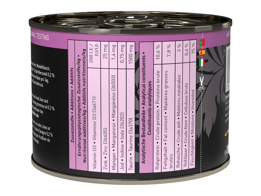 Lahodná konzerva pro kočky, která obsahuje pouze jehněčí maso, vývar, minerální látky a pupalkový olej. Konzerva je tak vhodná i pro kočky s citlivým zažíváním nebo pro alergické kočky. Jedná se o kompletní krmivo. Suroviny jsou vysoké potravinářské kvality a svým složením odpovídají přirozené kočičí stravě. Jsou bez konzervantů, umělých barviv a dochucovadel. Konzervy neobsahují geneticky upravené suroviny.