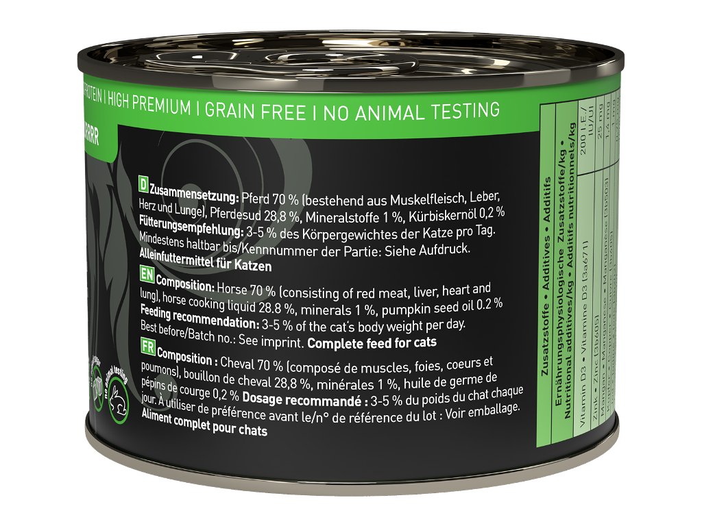 Excelentní konzerva pro kočky, která obsahuje pouze koňské maso, vnitřnosti a vývar, minerální látky a dýňový olej. Je proto vhodná i pro kočky s citlivým zažíváním nebo alergiky. Jedná se o kompletní monoproteinové krmivo pro kočky všech věkových kategorií a plemen.