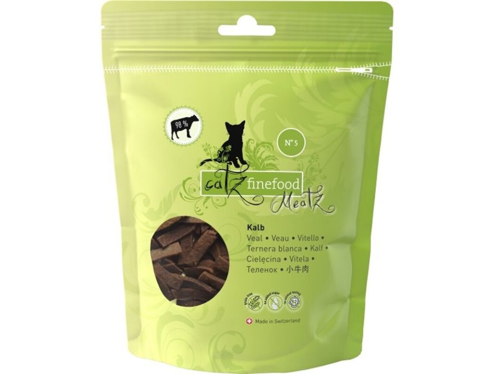 Jsou dokonalým doplňkem k vysoce kvalitnímu sortimentu mokrého krmiva Catz finefood. Telecí maso pochází ze Švýcarska od místních ekologických farmářů a producentů, kteří zvířata chovají podle zásad trvale udržitelného rozvoje. - křupavé proužky masa - bez umělých přísad a barviv - bez obilovin a cukrů - se sýrem cottage bez soli a laktózy - obsahují pouze jeden druh masa - ve znovu uzavíratelném obalu Catz finefood Meatz jsou vyrobené ve Švýcarsku. Složení: telecí maso 98%, sýr cottage 2% (bez soli a laktózy) Analýza: hrubé bílkoviny 40,2 %, hrubé tuky a oleje 31,9 %, hrubý popel 10,1 %, hrubá vláknina 0,3 % Doporučené dávkování: podávejte 5-10 proužků masa denně jako pamlsek, zajistěte kočce dostatek pitné vody. Datum minimální trvanlivosti a číslo šarže najdete na zadní straně obalu. Skladujte v suchu.