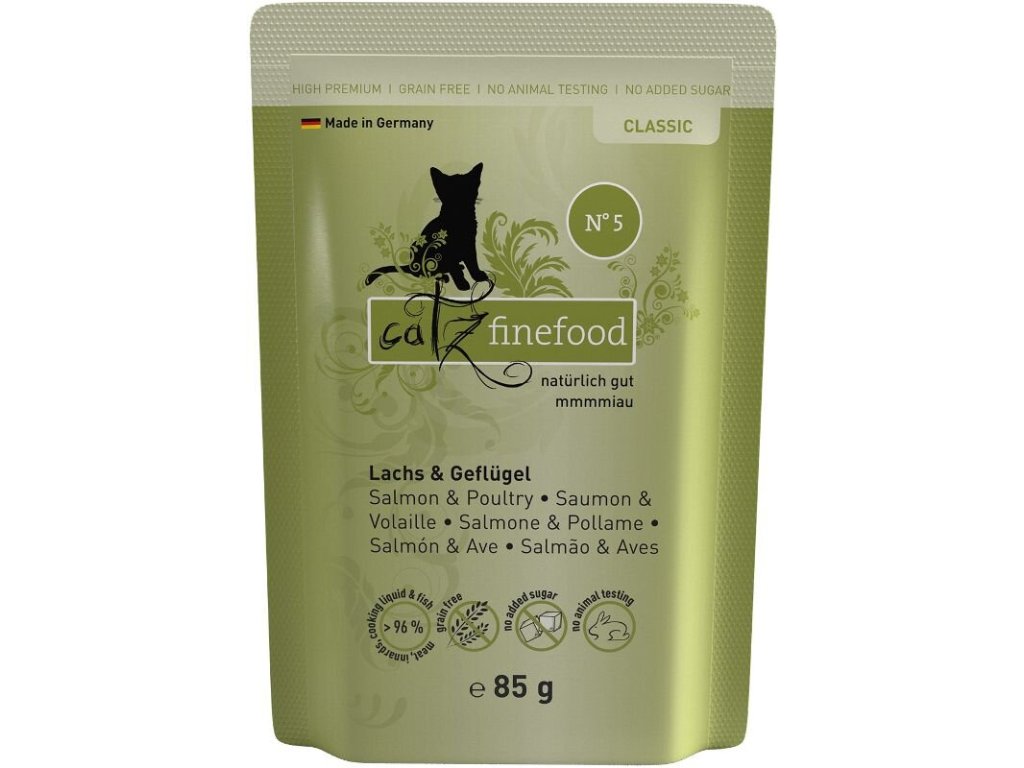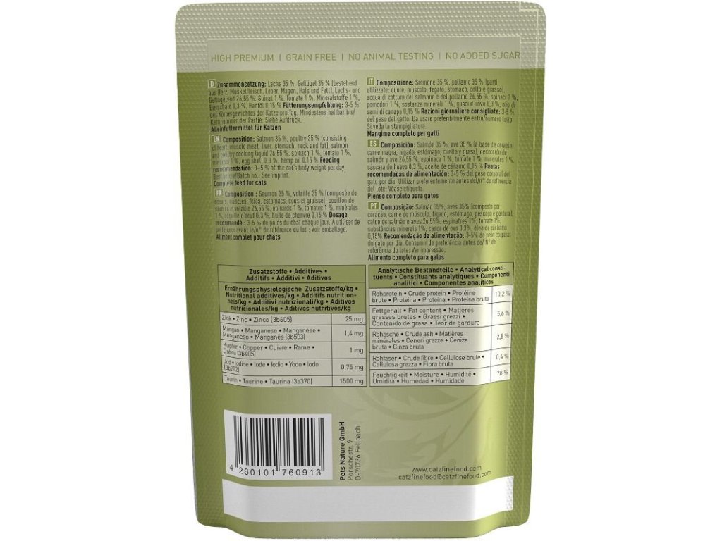 Lahodná kapsička pro kočky, která obsahuje vysoký podíl masa z lososa, jemného drůbežího masa, zdravý špenát a rajčata. Kapsičky Catz finefood obsahují pouze suroviny vysoké potravinářské kvality a svým složením odpovídají přirozené kočičí stravě. Jsou bez konzervantů, umělých barviv a dochucovadel. Kapsičky neobsahují geneticky upravené suroviny. Jedná se o kompletní krmivo.