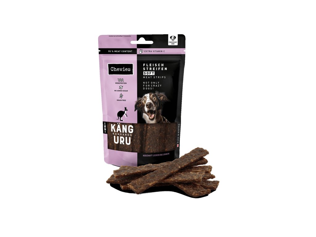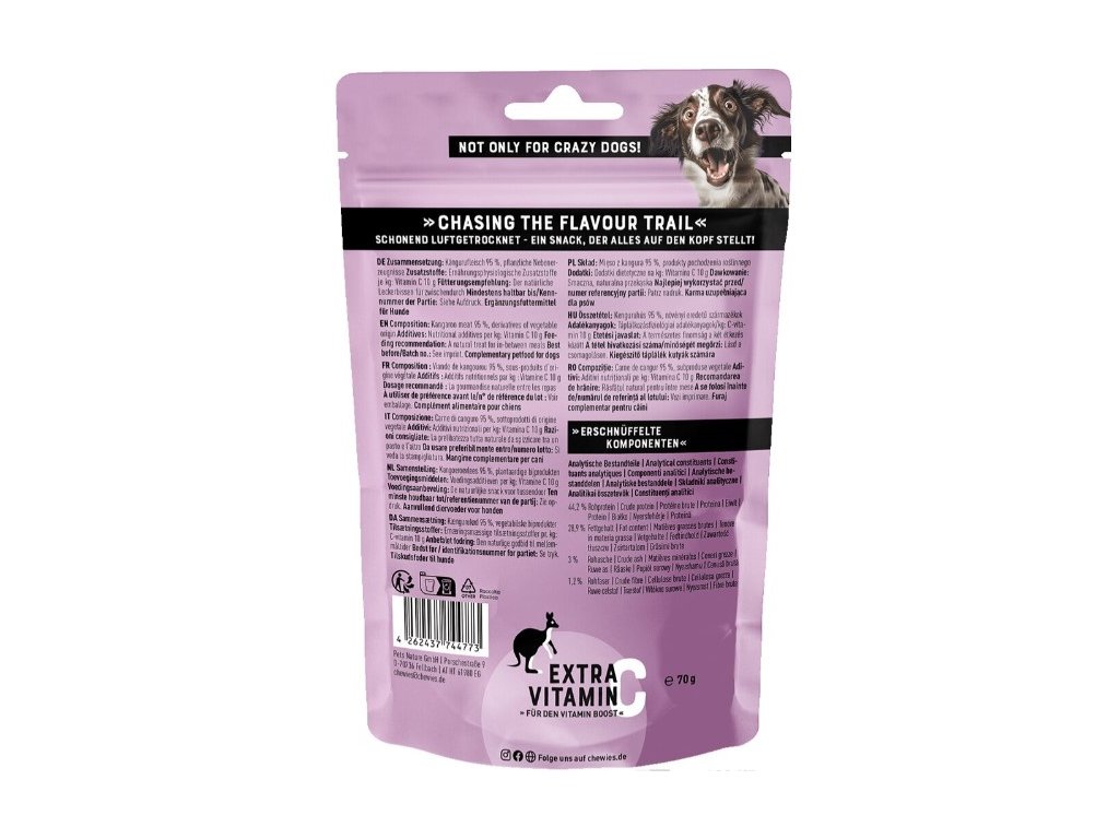 Plátky vzduchem sušeného masa s extra dávkou vitamínu C obsahují 95 % klokaního masa a díky monoproteinovému složení jsou vhodné i pro psy s potravinovými alergiemi. Nenajdete v nich obiloviny, přidaný cukr, umělá barviva, aromata ani konzervanty. Maso je šetrně sušené vzduchem, aby si zachovalo svou přirozenou chuť a živiny, a díky tomu je křehké, snadno se porcuje a pochutnat si na něm mohou i štěňátka a starší psy.