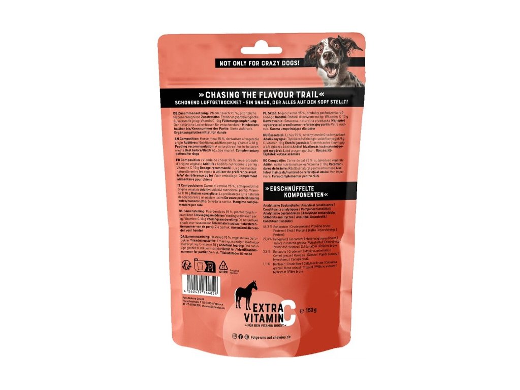 Vzduchem sušené plátky s extra dávkou vitamínu C obsahují 95 % koňského masa a díky monoproteinovému složení jsou vhodné i pro psy s potravinovými alergiemi.