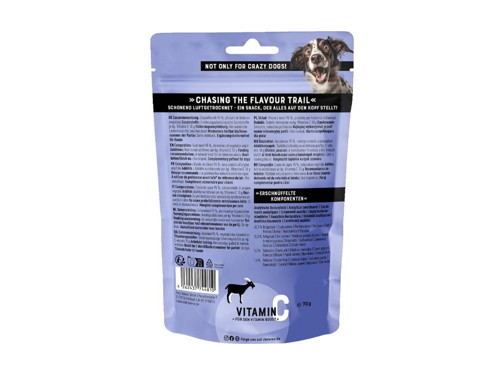 Plátky vzduchem sušeného masa s extra vitamínem C představují přírodní pochoutku pro psy všech věkových kategorií a velikostí, od štěňat až po seniory. Obsahují 95 % kozího masa a díky monoproteinovému složení jsou vhodné i pro psy s potravinovými alergiemi. Maso je šetrně sušené vzduchem, aby si zachovalo svou přirozenou chuť a živiny, a díky tomu je křehké a snadno se porcuje.