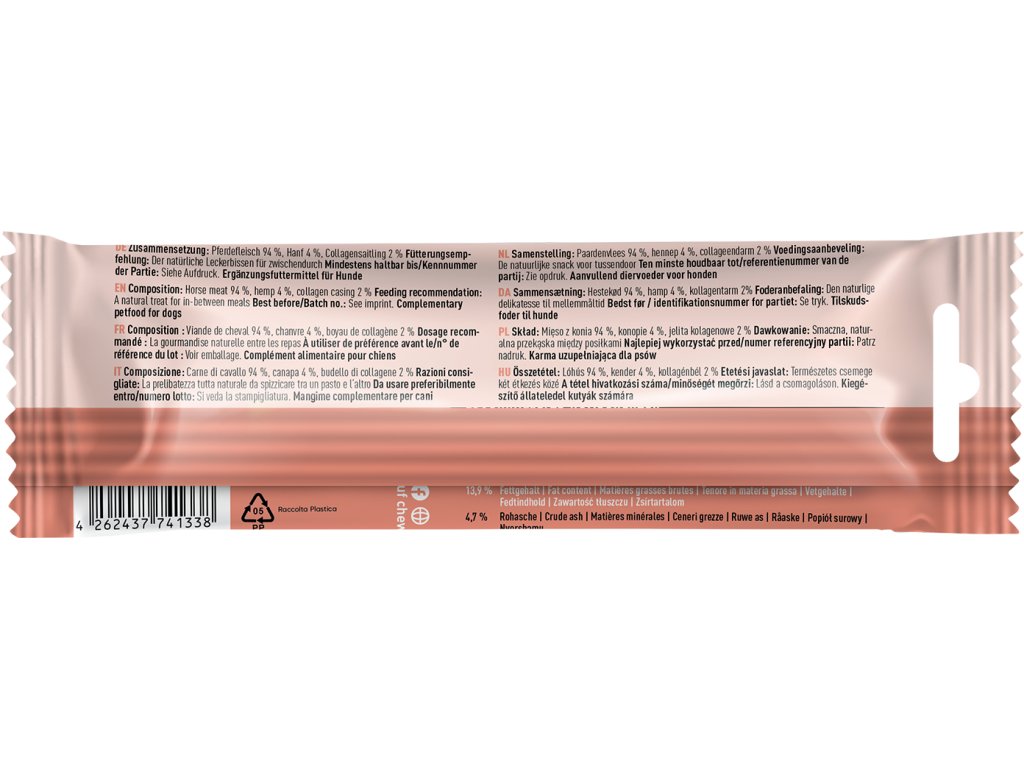 Složení: koňské maso 94 %, konopné výlisky 4 %, kolagenové střívko 2 %