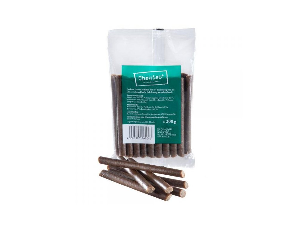 Poloměkké šťavnaté tyčinky pro psy s vysokým podílem masa. Ideální při výcviku nebo jako chutná odměna.Tyto chutné pamlsky byly vyvinuty ve spolupráci se psími školami a cvičiteli. Tyčinky jsou díky vysokému podílu masa velice dobře snášeny a psům velice chutnají.Velikost tyčinky je cca 13 cm. Na rozdíl od Chewies kostiček, se velmi dobře hodí jako extra odměna mezi tréninky nebo jako větší pamlsek. Tyčinky neobsahují cukr.Chewies jsou vyrobené v Německu.
