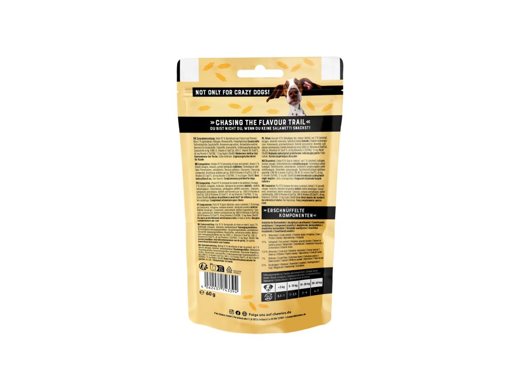 Jsou vyrobené z kuřecího masa a sýru bez laktózy a nenajdete v nich obiloviny ani přidaný cukr. Pochutnají si na nich psi všech plemen a věkových kategorií a díky vysokému obsahu proteinu a kolagenu jsou perfektní volbou i pro aktivní psy.