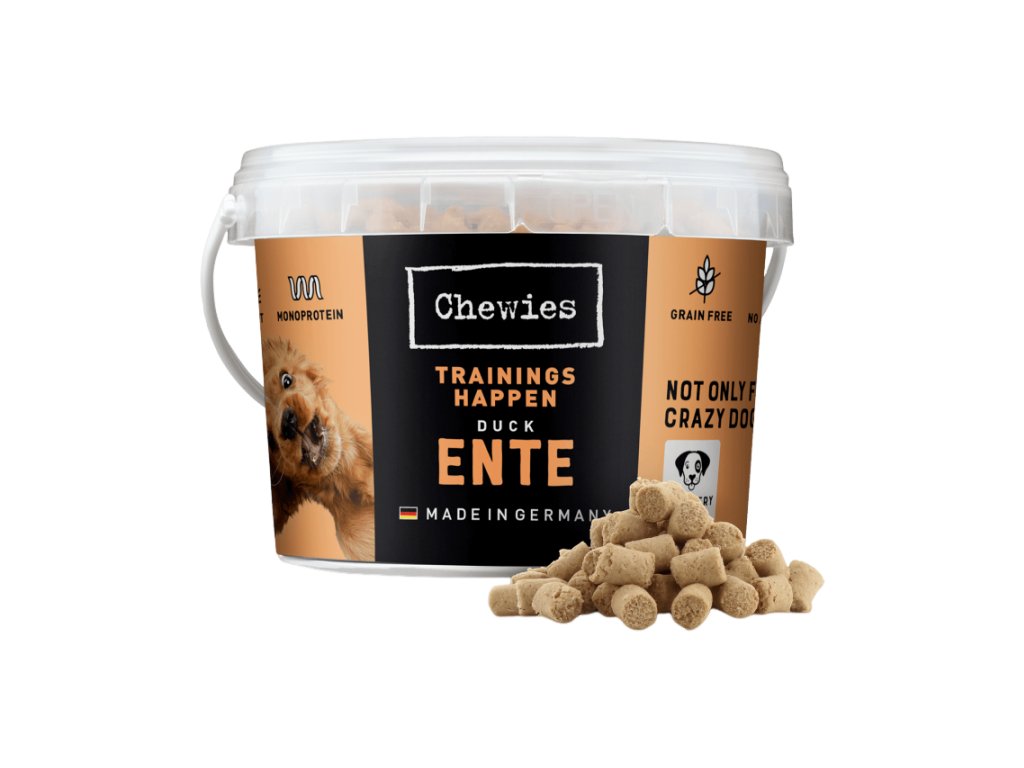 Chewies Trainings-Happen jsou vyrobené v Německu.Podávejte jako odměnu. Zajistěte dostatek pitné vody. Určeno pro psy.