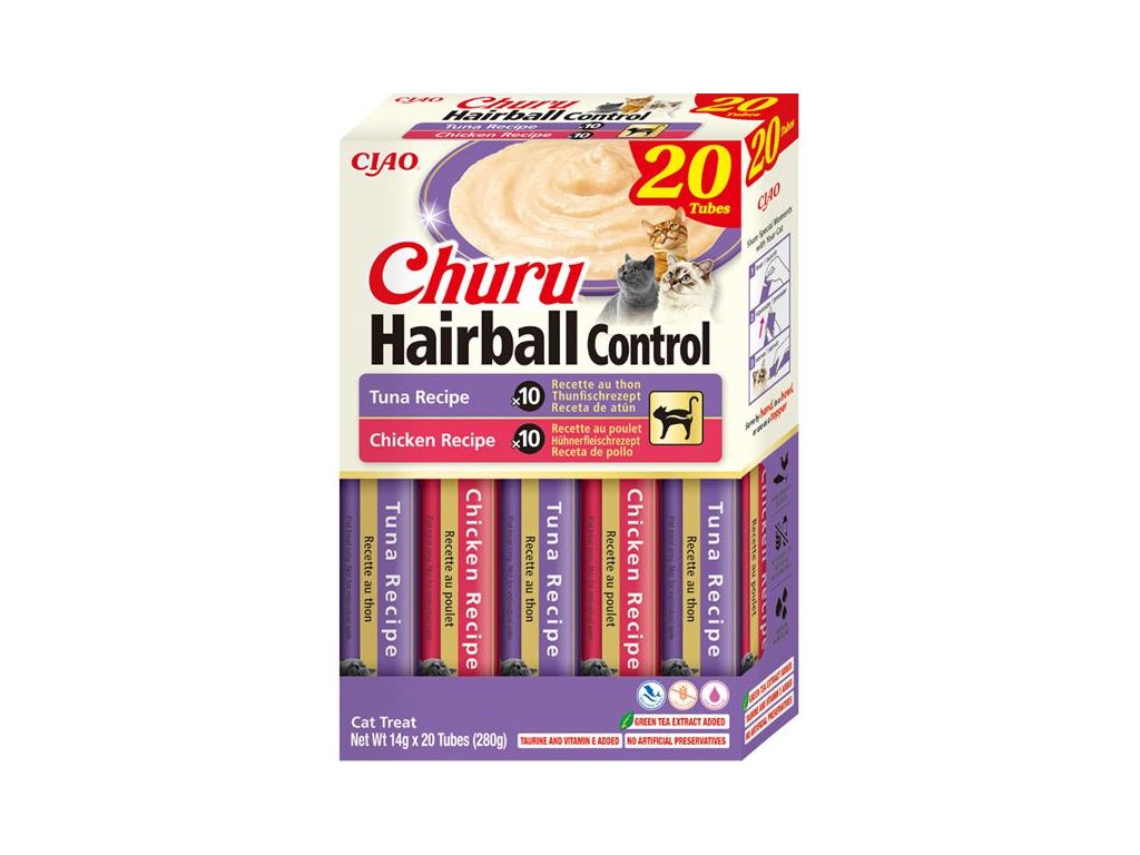 Pamlsky Churu Hairball Control díky své chuti a funkčnímu složení podporují trávení a pomáhají předcházet vzniku trichobezoárů (smotků chlupů) v trávicím traktu koček. Kočky pečují o svou srst 30–50 % bdělého času. Nerozpustná rostlinná vláknina a chitosan (nerozpustná vláknina ze schránek korýšů) pomáhají podporovat hladké trávení a snižovat riziko tvorby trichobezoárů. Pamlsky dále obsahují taurin a vitamín E.