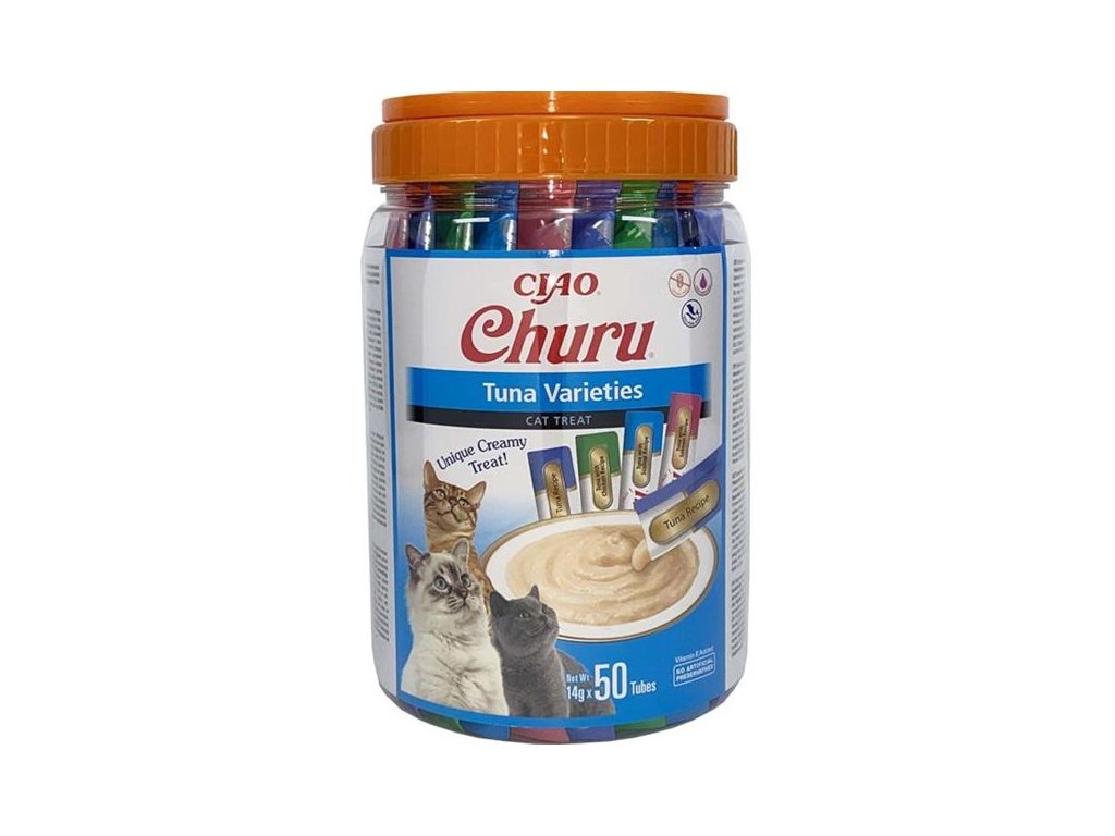 Výběr krémových pamlsků Churu ve variaci s tuňákem. Balení obsahuje celkem 50 pamlsků: 20× tuňák, 10× tuňák s kuřetem, 10× tuňák s hřebenatkou a 10× tuňák s lososem.Inovativní měkká konzistence pamlsků Churu vám umožní trávit společné chvíle s vaší kočkou hravým a interaktivním způsobem. Pamlsky mají vysoký obsah vody a díky tomu jsou vhodným doplňkem k suchému krmivu nebo skvělou hydratující pochoutkou pro kočky. Masová pyré Churu jsou ideální pro ukrytí tablety na odčervení či jiného léku, který je potřeba kočce nenásilně podat. Pamlsky Churu představují 100% přírodní a zdravé mlsání pro kočky všech věkových kategorií. S nízkým obsahem kalorií, bez konzervantů, chemických aromat, barviv a umělých dochucovadel.