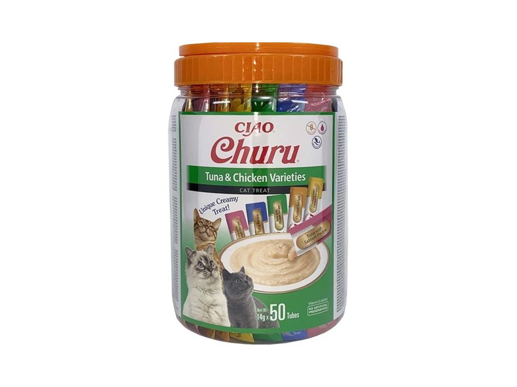 Výběr krémových pamlsků Churu ve variaci s tuňákem a kuřetem. Balení obsahuje celkem 50 pamlsků: 10× tuňák, 10× kuřecí, 10× tuňák s lososem, 10× tuňák s kuřetem, 10× kuřecí se sýrem.Inovativní měkká konzistence pamlsků Churu vám umožní trávit společné chvíle s vaší kočkou hravým a interaktivním způsobem. Pamlsky mají vysoký obsah vody a díky tomu jsou vhodným doplňkem k suchému krmivu nebo skvělou hydratující pochoutkou pro kočky. Masová pyré Churu jsou ideální pro ukrytí tablety na odčervení či jiného léku, který je potřeba kočce nenásilně podat. Pamlsky Churu představují 100% přírodní a zdravé mlsání pro kočky všech věkových kategorií. S nízkým obsahem kalorií, bez konzervantů, chemických aromat, barviv a umělých dochucovadel.