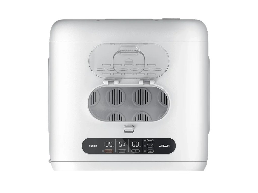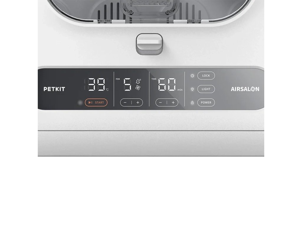 The PetKit pet dryer features a cubic design with rounded corners. It has ventilation openings on three sides to provide fresh air to your pet and deliver a gentle breeze to dry its fur, even in sensitive areas. The bottom of the device has a removable panel for easy cleaning. The interior of AIRSALON MAX Pro is spacious enough to comfortably accommodate two cats or small dogs, allowing them to stretch out and enjoy the warm airflow. There are transparent doors on the front of the dryer to monitor your pet's well-being. Additionally, there is a touch-sensitive LED panel for user-friendly operation. Inside the dryer's ceiling, there is a built-in light, allowing for drying your pet even at night.